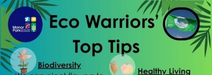 May be an image of text that says "Manor ParkGcHbo! Eco Eco Warriors Top Tips Biodiversity. Healthy Healthy_Living Living We can plant flowers to help bees and butterflies We can eat healthy food Global Citizenship We can learn about people around the world when we leave a room Energy. We can turn off lights Water We can turn taps off properly Litter We can put litter Marine in the bin We can keep litter away from rivers and the sea Waste We can reduce our waste Transport We can walk to school when possible WARRIORS ECO"