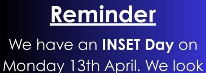 May be an image of text that says "Manor ว Park ParkcHoo F SCHOOL “” Reminder We have an INSET Day on Monday 13th April. We look forward to welcoming the children back for the start of the Summer Term on Tuesday 14th April."